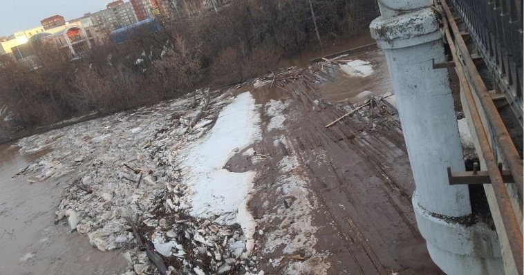 Затор возник перед мостом через Чепцу из-за того, что выше по течению кто-то сделал настил на льду из досок. Со временем доски вмерзли в лед и этот участок принесло к опорам моста.