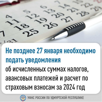 Не позднее 27 января необходимо подать уведомления об исчисленных суммах налогов, авансовых платежей и расчет по страховым взносам за 2024 год