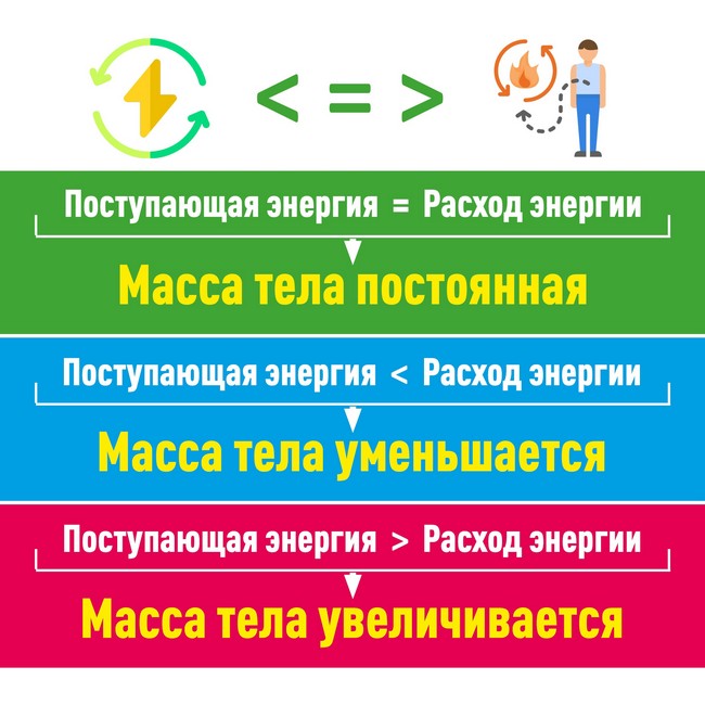 Из 1 грамма белка организм получает 4 ккал, так же, как и с углеводами, а из 1 грамма жиров – 9 ккал. Если энергия пищи полностью расходуется, то набора веса не происходит. Поэтому важно не потреблять пищи больше, чем расходуешь энергии.
